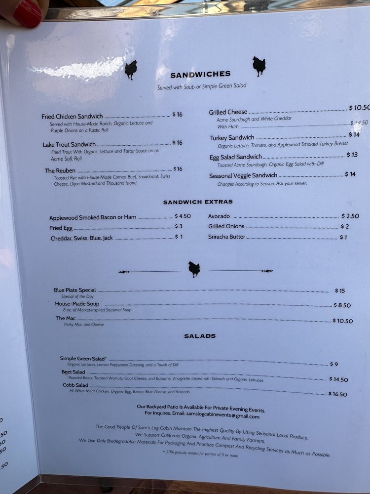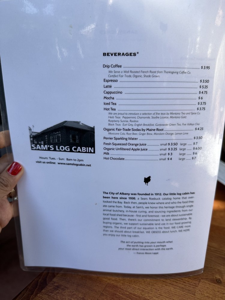 “ In the small town of Albany, Sam's Log Cabin is a favored brunch destination. Living within walking distance my entire life, I'm still embarrassed to say this is my first visit--and not my last! Most are familiar with the vintage log cabin exterior. Don't enter inside (only for take-out), instead put your name down for their outdoor patio seating. You're greeted with the smell of home-style cooking and friendly attentive service. Drinks and condiments are self-serve, and food comes out quickly. The Lake Trout and Eggs had my name on it; I opted for eggs over easy. The trout was mild and firm, I enjoyed the sweet and savory balance of the hash, and the eggs were well-cooked. My companion had the Daily Scramble which he liked. It was chorizo, broccolini, and mozzarella but specials rotate daily. We agreed our dishes were well seasoned and very filling. I'm a huge supporter of the sustainable, locally sourced, and organic ingredients used to make our meals. If you're looking for a home-style breakfast or lunch with unique charm, Sam's Log Cabin is a great spot in the East Bay. The restaurant is on San Pablo with street and neighborhood parking. With how close I live to it, it'll be on my brunch rotation! ”